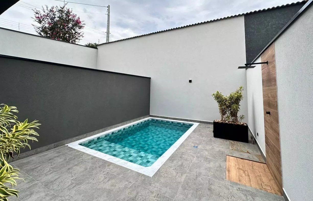 • Piscina iluminada com paisagismo e decoração externa